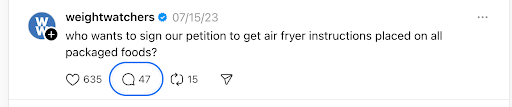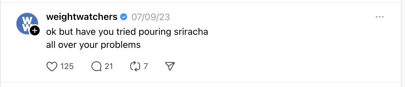 Reimagined WeightWatchers’ social voice with quick-turn threads and mantras that (cleverly) said the quiet parts out loud. The brand’s most-liked Instagram post anthropomorphized Monday, was written in a minute, and became the template for WW’s more modern tone.